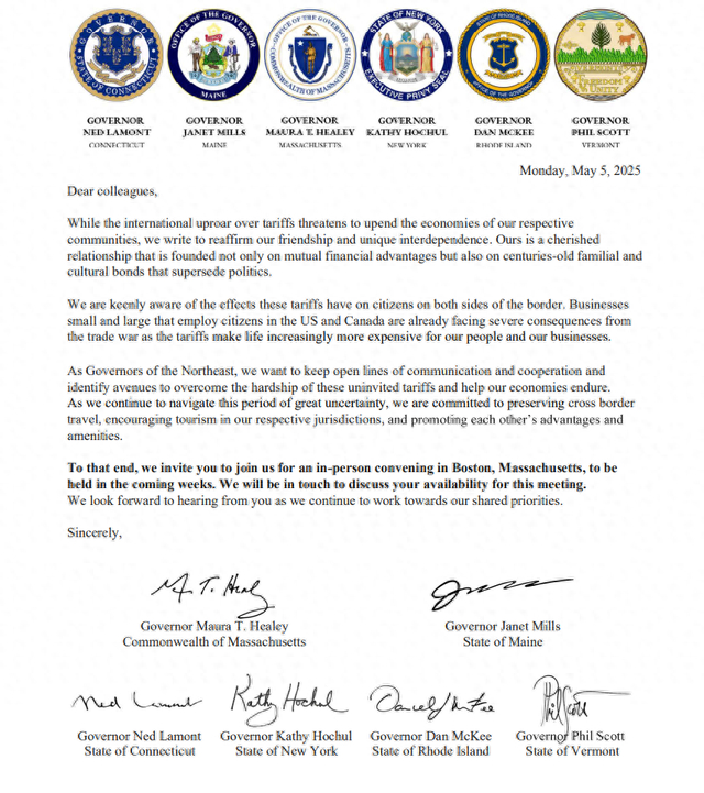 美国各州的声明表示,美国东北部六个州邀请加拿大省长在波士顿进行讨论,讨论内容包括“特朗普总统关税的影响,以及美国和加拿大领导人如何继续共同努力,保持强有力的贸易关系”。