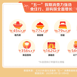 不少人在假期选择购物休闲,数据显示,假期期间,演唱会、KTV抖音团购订单分别增长162%和54%。此外,珠宝首饰抖音团购订单量同比增长高达356%。