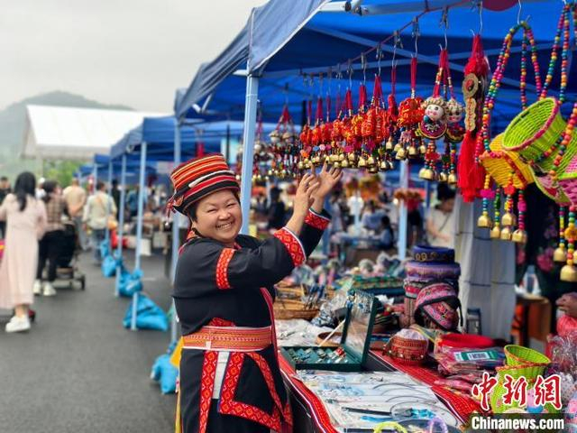 活动现场,民族特色小吃摊位上的壮家“五色饭”、咸香软糯的竹叶粽、壮家酿豆腐等传统美食香气扑鼻,引得不少游客争相前来打卡,品尝传统美食。山货摊位上的壮家丝苗米、高山茶、蜂蜜、菌菇等特色农产品,吸引游客前来挑选。在不远处的壮绣服饰摊位,游客头戴银饰,身着针脚细密的精美壮锦服饰,伴着铜鼓铿锵,走进山水如画、民族风情浓郁的特色村寨,近距离感受民俗文化的独特魅力。