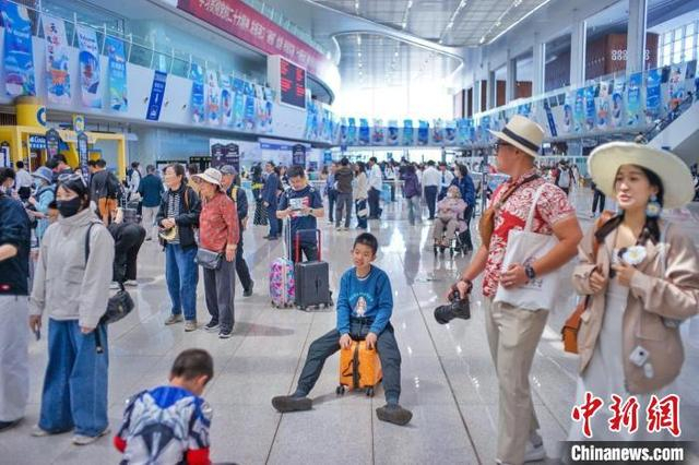 5月1日,天津国际邮轮母港登船大厅,游客等待上船。当日,天津国际邮轮母港迎来皇家加勒比游轮“海洋赞礼号”、东方邮轮“梦想号”和大洋邮轮“芮吉塔号”三艘国际邮轮同时停靠,这是天津国际邮轮母港复航以来首次“三船同靠”,当天近1.5万名旅客出入境,其中办理“240小时过境免签”旅客超400人次,双创邮轮复航以来单日纪录。记者 佟郁 摄