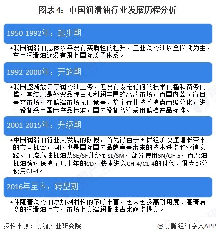 润滑油市场主要受宏观经济发展速度、交通运输、机械设备等行业发展的影响。随着中国经济多年来的高速发展,我国润滑油市场规模不断扩大,总体保持增长态势。从历史发展来看,我国润滑油市场的发展可以分为四个阶段,分别为起步阶段、开放阶段、升级阶段和转型阶段。
