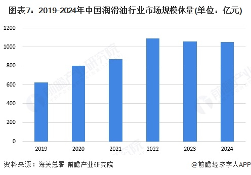 我国润滑油市场处于成熟阶段,润滑油下游汽车、工业等主要应用领域需求拉动效应较弱。2019-2024年,我国润滑油市场规模呈先增后减的走势。近几年受新能源车持续替代传统燃油车的影响,交通用润滑油需求下降,而工业用润滑油需求则有所回升。前瞻通过润滑油的表观需求量和进出口均价综合测算,2024年中国润滑油行业市场规模为1051亿元,同比下降0.88%。