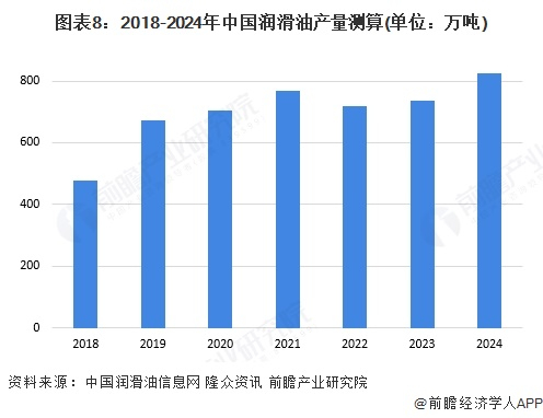 据中国润滑油信息网数据,润滑油中添加剂的含量约占1%-30%,即基础油含量约占70%-99%。而在基础油的需求量中,有75%用于润滑油的生产制造,前瞻初步测算,2024年中国润滑油产量约为826万吨。