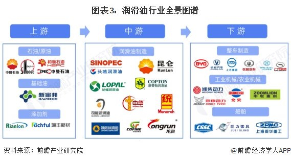 中国润滑油上游产业包括石油开采/炼油、基础油、添加剂,代表企业包括企业有中国石油、中国石化等炼油企业,瑞丰新材、康泰股份等的润滑油添加剂制造企业,此外还有供应含氟润滑油基础油的供应商新宙邦。中游产业企业有龙蟠科技、康普顿、中国石油、中国石化等工业和车用润滑油企业。下游产业企业有汽车制造、工程机械、船舶制造行业的相关企业,如广汽集团、潍柴动力、中国船舶等。