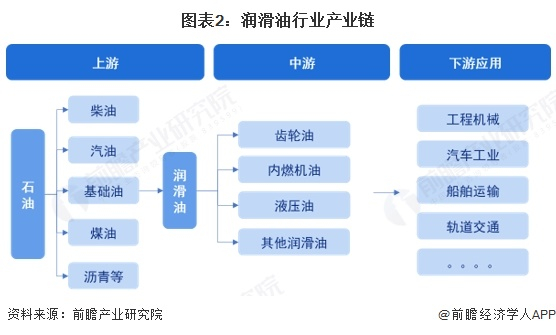 目前我国润滑油产业链上游主要为石油/原油的开采、润滑油基础油的提炼及添加剂供应;润滑油中游主要为润滑油的生产,从使用用途来分可以分为内燃机油、齿轮油、液压油、压缩机油等;润滑油的下游主要为工程机械、汽车、船舶运输、轨道交通等等。