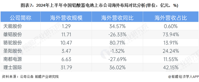 从海外布局上看,根据2024年上半年上市企业披露数据,理士国际和雄韬股份是是海外业务的领先企业;骆驼股份海外业务规模较快,2024年上半年同比增长高达80.71%。