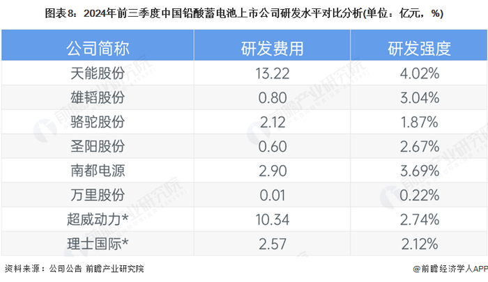 从上市企业的研发水平上看,天能股份和超威动力作为行业龙头,不仅营收规模相对领先,研发费用也远高于其他上市公司,2024年前三季度研发费用均超10亿元,且天能股份研发强度在行业上市公司中处于领先地位。万里股份研发表现相对不尽人意,2024年前三季度研发费用不足100万元,研发强度较低。
