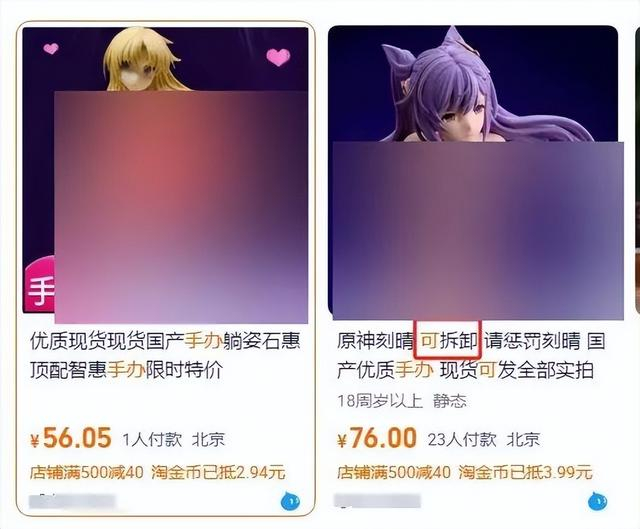 媒体查询发现,有些网店的宣传图上,手办的衣服十分暴露,店家给人物隐私部位潦草地打了码,但文字介绍中却标注“可脱”“可拆卸”。还有的网店会在充满诱惑力的商品图片上写着“联系客服看图”,联系后客服会发来许多该手办没有衣服的各角度无码图片,包括隐私部位特写。