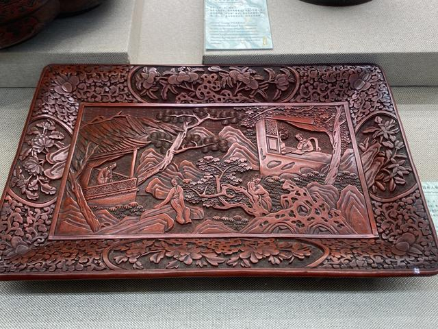 新民晚报记者在现场看到,剔红园林人物图方盘的亭台楼阁栩栩如生,黑底剔红则如云层般层叠。“这款方盘以木胎为底,涂了上百层朱漆后精雕细刻而成的。”钱鸿芳介绍,深浅浮雕层次分明,可见当时的匠人刀法圆熟流畅,艺术水平也极高。