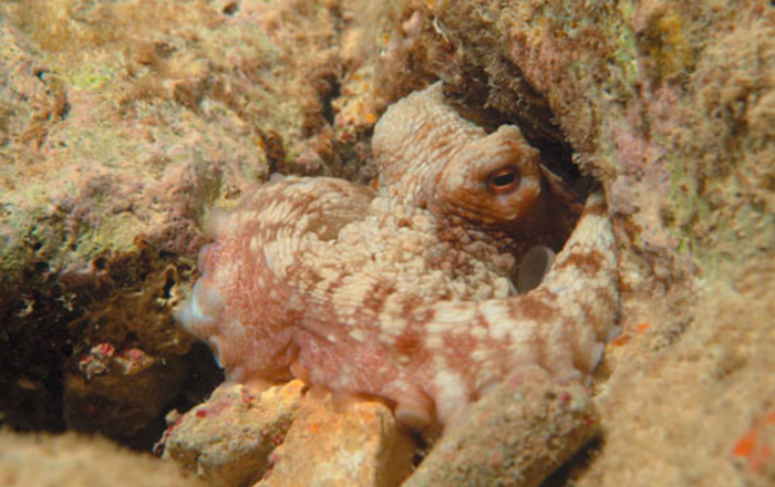 〓 加勒比海博耐尔小岛上的章鱼,它在岩石缝隙中得到了很好的保护,并收集石头放在洞穴的入口前 / [5]