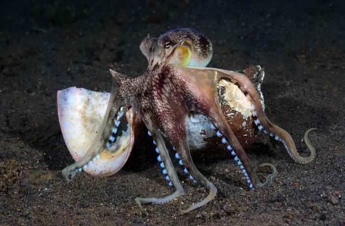 章鱼自知天生柔软,所以时刻都在为自己收集庇护空间。一组研究人员在印度尼西亚研究条纹章鱼时发现,这些章鱼很喜欢收藏被人类丢弃的椰子壳。它们从泥沙里捡到椰子壳,还会借助水流冲洗干净。它们会拎着心爱的椰子壳在海底“踮脚”走,或者把两个半片椰子壳拼成一个球,然后藏进去[12]。