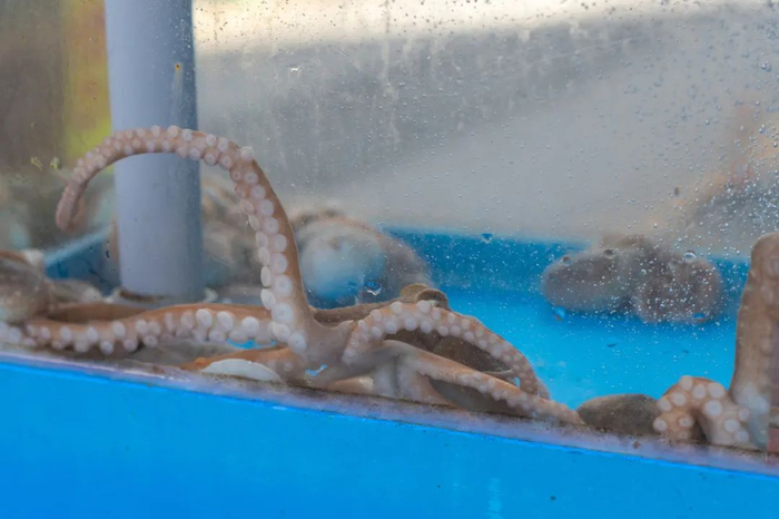 〓 研究人员认为,章鱼“特别不适合圈养和大规模生产的生活。对于拥有如此“复杂的神经系统和大脑”的动物来说,禁闭尤其残酷” [20],图为一家餐馆的水族箱里出售中的章鱼 / 图虫创意