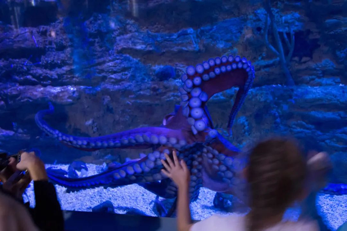 〓 当游客把手平摊在水族箱外的玻璃上时,章鱼会爬过来,用它的腕覆盖住游客的手,并直视他们的眼睛[9] / 图虫创意