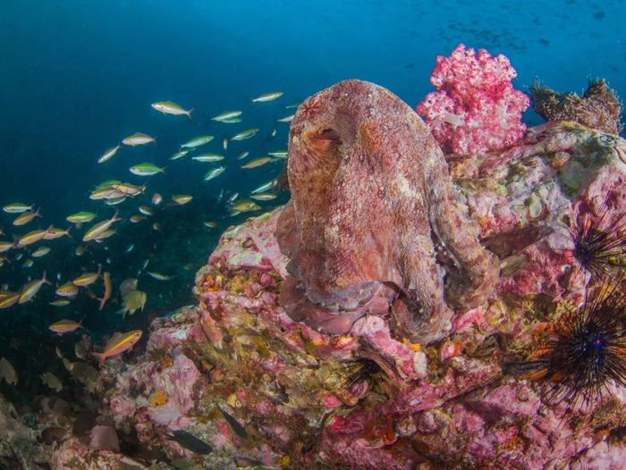 〓 在珊瑚海斑驳的光芒中,从1米左右的距离来看,珊瑚礁和坐在上面的章鱼根本无法区别 / 图虫创意