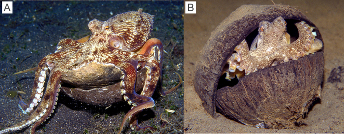〓 (A)条纹章鱼携带两个叠放的椰子壳的同时“踮脚走”(B)条纹章鱼使用组装成避难所的椰子壳 / [12]