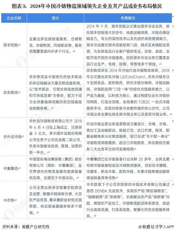 中国冷链物流领先企业主要有顺丰控股、京东物流、中外运冷链等,企业具体布局情况如下: