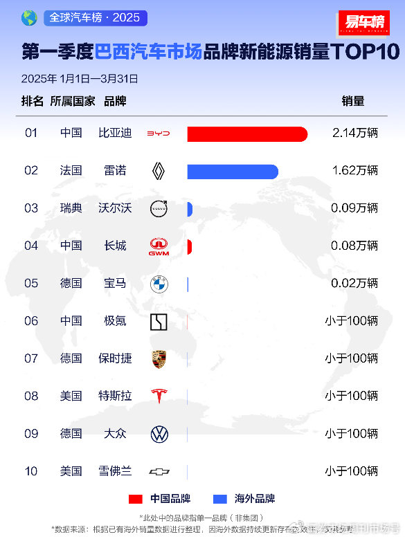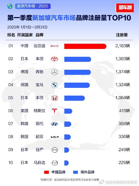 2025年一季度,比亚迪在全球多市场荣膺销冠