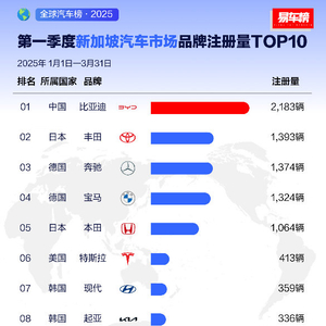 在素有“汽车品牌试金石”之称的中国香港和新加坡,比亚迪以颠覆性表现打破传统巨头的垄断。据易车数据统计,比亚迪一季度在中国香港以2500辆的销量首次超越丰田与特斯拉,首次问鼎全品牌季度冠军。其与高端子品牌腾势合计占据当地超30%的汽车登记量,意味着每三辆新车中便有一辆悬挂比亚迪标识。这种杰出表现,在长期由日系、德系品牌主导的成熟市场堪称“现象级突破”。