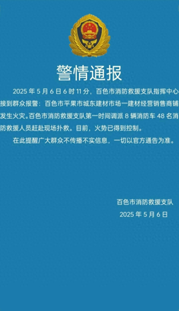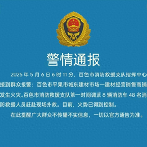 2025年5月6日6时11分,百色市消防救援支队指挥中心接到群众报警:百色市平果市城东建材市场一建材经营销售商铺发生火灾。百色市消防救援支队第一时间调派8辆消防车48名消防救援人员赶赴现场扑救。目前,火势已得到控制。