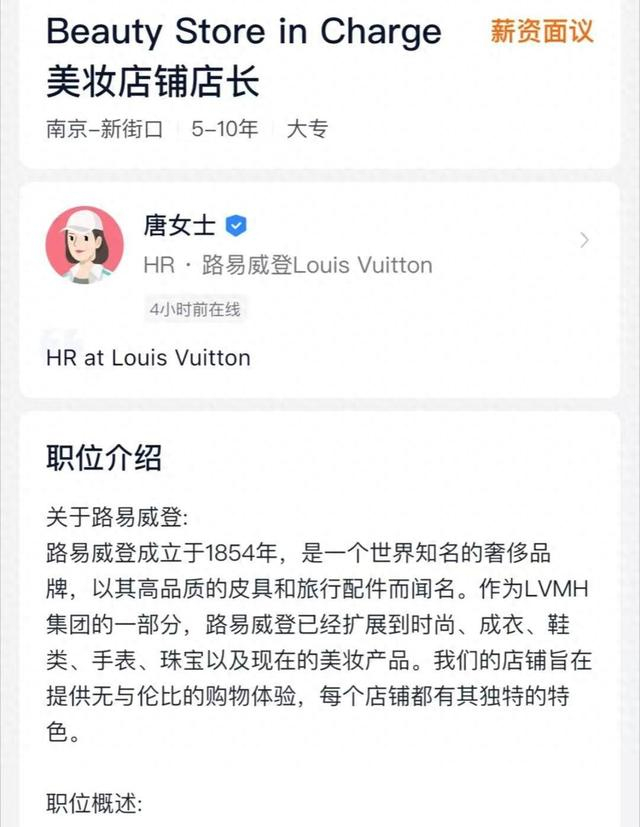 近日,法国奢侈品牌路易威登(Louis Vuitton)在招聘平台上发布美妆门店岗位信息,工作地点明确标注为南京德基广场。招聘职位包括美妆店铺店长、美妆造型师等,要求应聘者具备至少5年化妆品或奢侈品零售经验,显示出品牌对专业性的高要求。