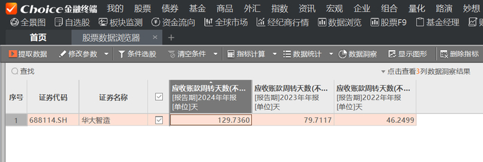 截至2024年末,华大智造应收账款14.76亿元,相比2023年末增加112.07%,高于期间3.48%的营收增幅。东方财富Choice显示,公司2024年应收账款周转天数(不含应收票据)达到130天,而之前的2022年和2023年该指标分别为46天、80天。