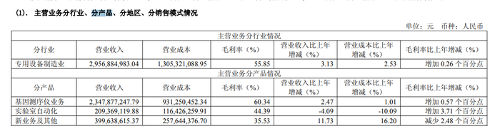 根据2024年报披露,华大智造各大业务板块均实现增长。其中,基因测序仪业务实现收入23.48亿元,同比增长2.47%;实验室自动化业务实现收入2.09亿元,较2023年(与突发公共卫生事件不相关的实验室自动化业务)增36.69%;新业务实现收入4亿元,较2023年(与突发公共卫生事件不相关的新业务)增长57.05%。