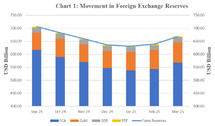 央行周一在半年度外汇储备报告中指出,按美元价值计算,截至2025年3月底,黄金在印度外汇储备总额中的占比已升至11.70%,较2024年9月底的9.32%明显增长,相比2021年3月底的5.87%更是翻了一番。