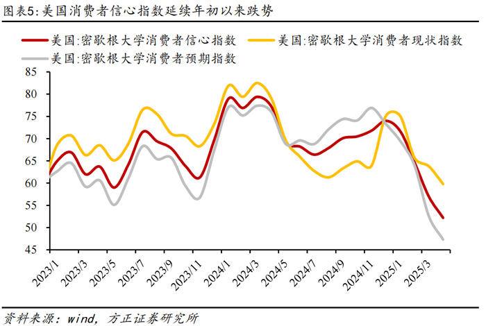 美国4月密歇根大学消费者信心指数创2022年8月以来新低,从3月的57.0大幅降至4月的52.2,消费者现状指数与消费者预期指数同时呈现显著下降。