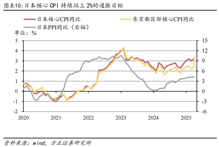 2025年4月日本公布数据显示,日本通胀压力显著提升。4月东京CPI录得3.4%的同比增长,较前值2.4%大幅上涨,是2023年7月以来首次突破3%。3月日本核心CPI同比增长3.2%,高于前值3.0%,持续站上2%的通胀目标。新财年伊始,日本有超4000种食品涨价,叠加输入性成本压力上升,日本通胀被推高。4月不包括能源和生鲜食品的东京CPI录得3.1%,较前值2.2%大幅上涨,显示通胀有从能源、食品向其他领域扩散的趋势。