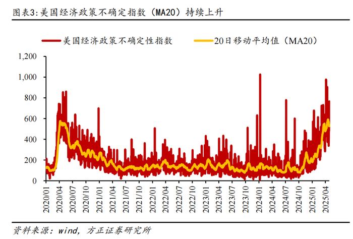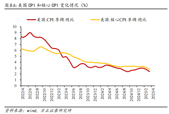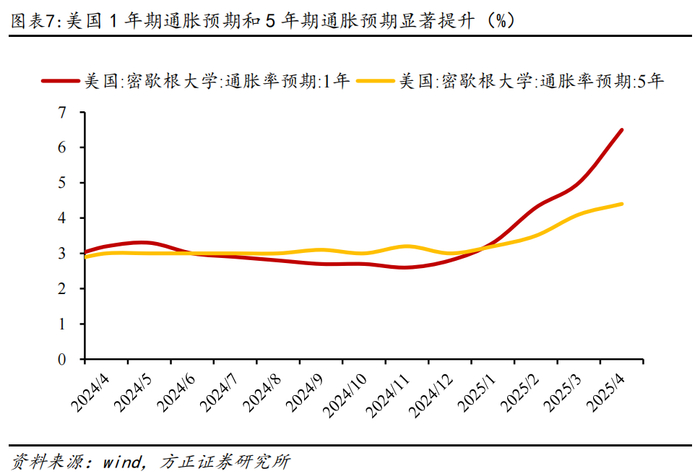 4月公布数据显示,美国3月消费者价格指数(CPI)同比上涨2.4%,环比下降0.1%,核心CPI同比上涨2.8%,环比上涨0.1%。3月通胀数据低于预期,但或尚未反映加关税的持续影响,4-5月数据相对关键。通胀预期方面,1年通胀率预期和5年通胀率预期自年初以来呈现持续增势。美国4月的1年期通胀率预期上升至6.5%,5年期通胀率预期上升至4.4%。