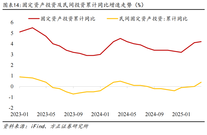 投资增速有所回升。2025年一季度,全国固定资产投资(不含农户)103174亿元,同比增长4.2%(按可比口径计算),增速比前两月加快0.1个百分点,较2024年显著加快1个百分点。其中,民间投资同比增长0.4%,民间投资同比涨幅扩大。分领域看, 2025年一季度制造业投资增长9.1%,分别较2024年全年和2025年前两个月放缓0.1和加快0.1个百分点;基础设施投资(不含电力、热力、燃气及水生产和供应业)同比增长5.8%,较2024年全年和2025年前两个月分别加快1.4和0.2个百分点。