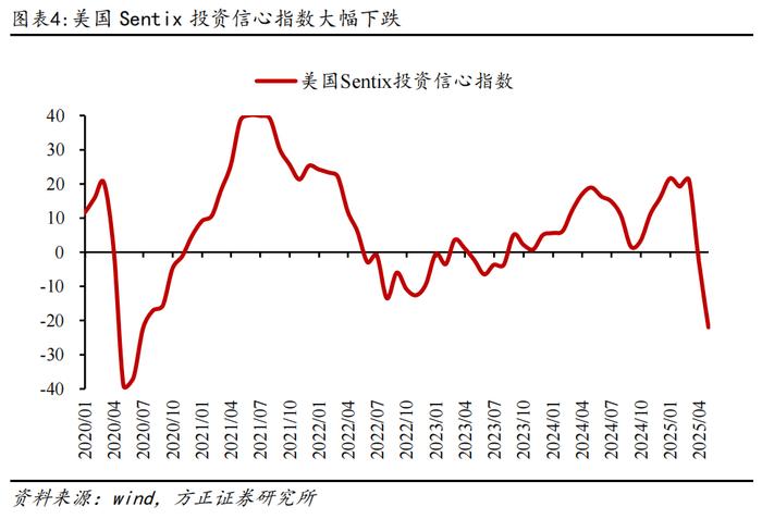 2025年4月,美国Sentix投资信心指数由3月的-2.7大幅降至-22.0,为2020年6月以来的最低点,负值进一步加深,显示出投资者对经济增长的信心不足。通常情况下,正值表示投资者对经济前景较为乐观,负值则意味着投资者预期经济增长将放缓甚至出现衰退。