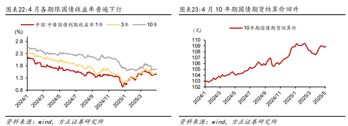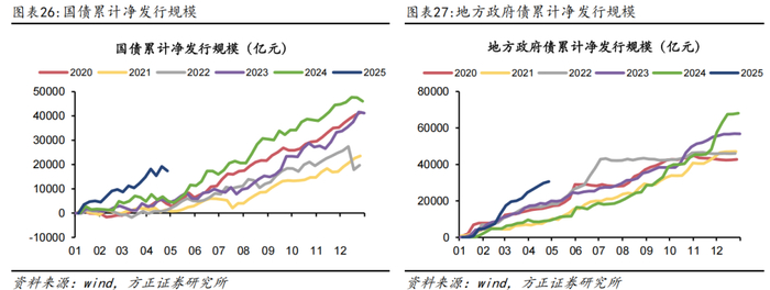 债券供给方面,截至4月26日,25年国债累计净发行17388亿元,地方政府债累计净发行30665亿元,政策银行债累计净发行4237亿元。货币供给方面,4月 25日,央行开展6000亿元MLF操作,当月有1000亿元MLF到期,实现净投放5000亿元,2025年4月MLF期末余额46570亿元。本次MLF净投放量显著增长,释放稳增长信号。
