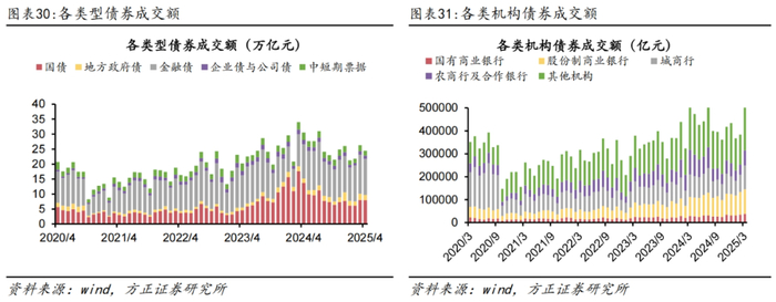交易行为方面,各类债券热度均有所回落,地方政府债成交降幅明显。截至4月28日,4月国债成交额7.97万亿元,较3月7.99万亿元小幅减少。4月地方政府债成交额1.75万亿元,较3月2.09万亿元大幅回落。4月金融债成交额11.97万亿元,较2月13.03万亿元有所降低。4月企业债与公司债成交额1.13万亿元,较3月1.24万亿元有所下跌。4月中短期票据成交额1.66万亿元,较3月1.98万亿元大幅减少。