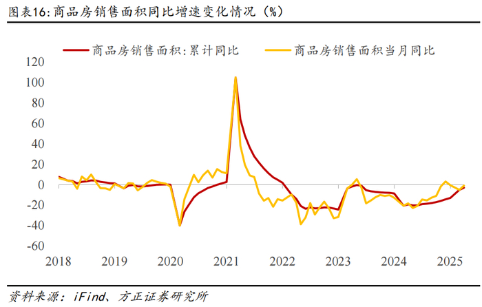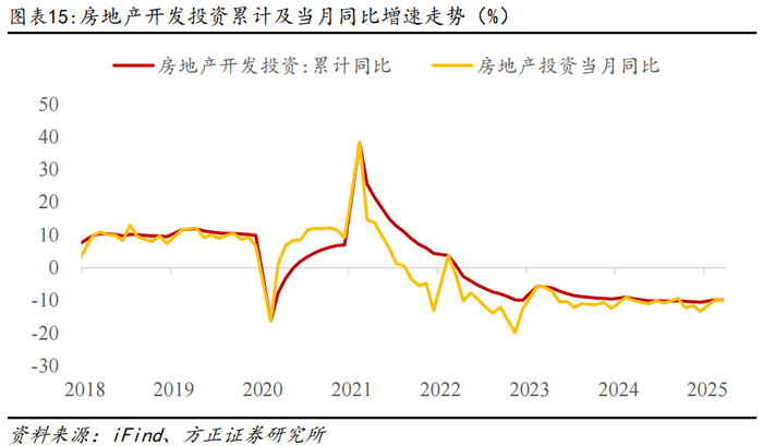 房地产市场从供需两端来看延续止跌回稳趋势。2025年一季度,全国房地产开发投资19904亿元,同比下降9.9%(按可比口径计算),2024年同比跌幅为10.6%,2025年前两月跌幅为9.8%,仍处于磨底阶段。从单月趋势来看,3月份,房地产开发投资当月同比增速为-10%,较前两个月跌幅略扩大了0.2个百分点。从房企开工竣工情况来看,3月份,房屋竣工面积当月同比下降了11.5%,新开工面积较去年同期下滑了18.1%,跌幅均较此前收窄。