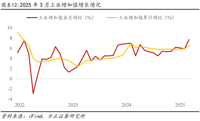 工业生产明显提速。2025年一季度,全国规模以上工业增加值同比增长6.5%(增加值增速均为扣除价格因素的实际增长率),比2024年全年加快0.7个百分点。单月来看,3月份,规模以上工业增加值同比实际增长7.7%,增长较此前明显提速;从环比看,3月份,规模以上工业增加值比上月增长0.44%。分行业看,2025年一季度,装备制造业及高科技制造业增加值增长显著提速。