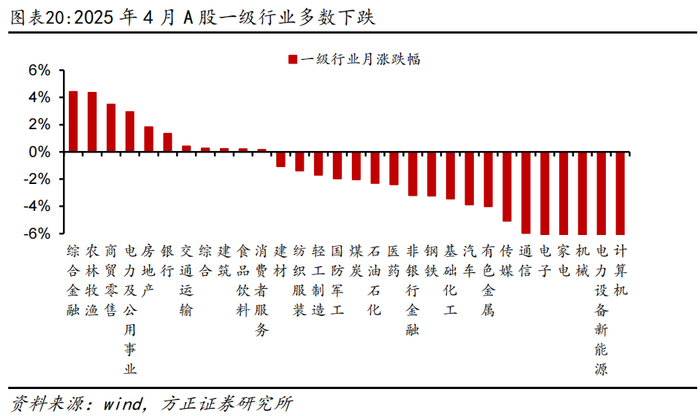分行业来看,截至2025年4月26日,本月aA股一级行业多数下跌。综合金融和农林牧渔板块领涨,均录得4.4%的涨幅,商贸零售、电力及公用事业、房地产分别上涨3.5%、2.9%、1.8%。计算机、电力设备新能源、机械本月表现垫底,分别下跌7.7%、6.7%、6.3%。