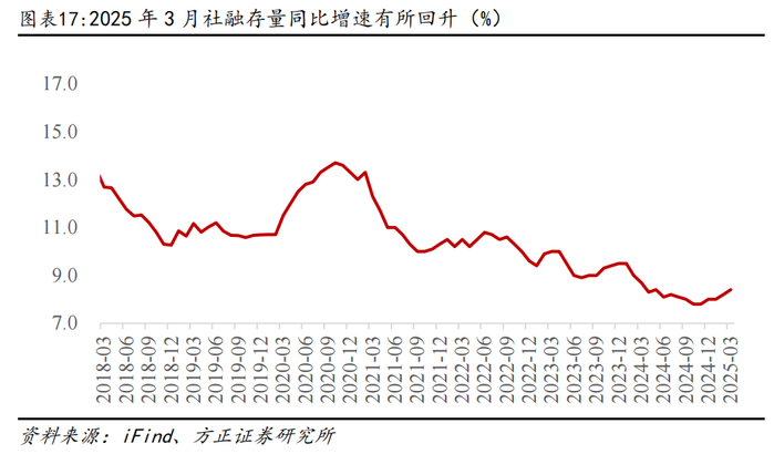 金融数据总量与结构均有改善。4月13日,中国人民银行公布3月金融数据。2025年3月新增社融5.89万亿,同比多增10559亿元,环比多增3.66万亿元,高于过去三年同期4.96万亿的平均水平。社融存量同比增速为8.4%,较上个月上升0.2个百分点,2025年3月新增人民币信贷3.64万亿,同比多增5500亿元。整体看,本月社融同比数据继续改善,增长动力主要来源于政府债券的高增和人民币贷款的恢复,财政政策持续前置发力,整体信贷结构有所优化。