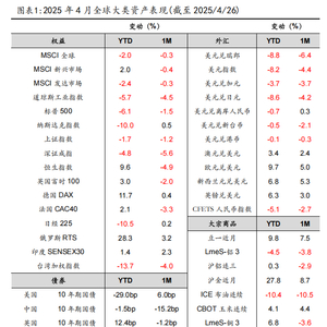 2025年4月全球股市大幅波动,美元指数大跌,黄金价格创新高。权益市场方面,新兴市场、发达市场均录得下跌。债券市场方面,美国10年期国债收益率上行6.0bp,其余各国10年期国债收益率普遍下行。大宗商品方面,黄金价格持续攀升创历史新高,铜铝价格回落,原油价格大幅下跌,大豆价格出现明显上涨。