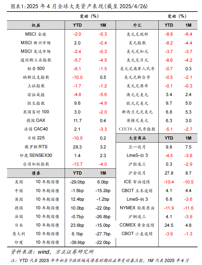本文来自方正证券研究所于2025年5月1日发布的报告《关税博弈边际缓和,均衡配置抵御波动——方正证券大类资产配置报告2025年5月份总第85期》。