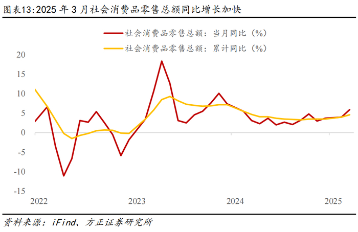 消费增长继续加快。2025年一季度,社会消费品零售总额124671亿元,同比增长4.6%,比上年全年加快1.1个百分点。其中,除汽车以外的消费品零售额113434亿元,增长5.1%。从单月增速来看,2025年3月份,社会消费品零售总额40940亿元,同比增长5.9%,前两个月增速为4.0%;其中,除汽车以外的消费品零售额36610亿元,增长6.0%。