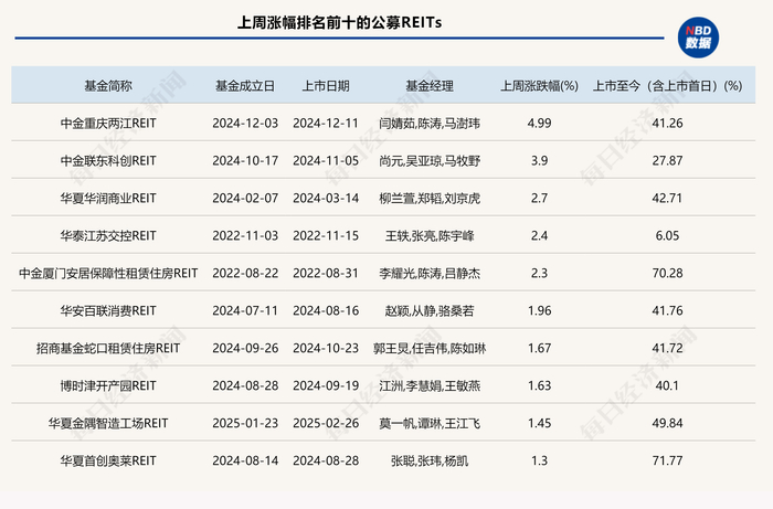 具体产品方面,根据Wind数据,全市场已经上市的65只公募REITs中有34只环比上涨,另外31只则出现下跌。涨幅排名前三的分别是中金重庆两江REIT、中金联东科创REIT 和华夏华润商业REIT,周内分别上涨了4.99%、3.9%和2.7%。