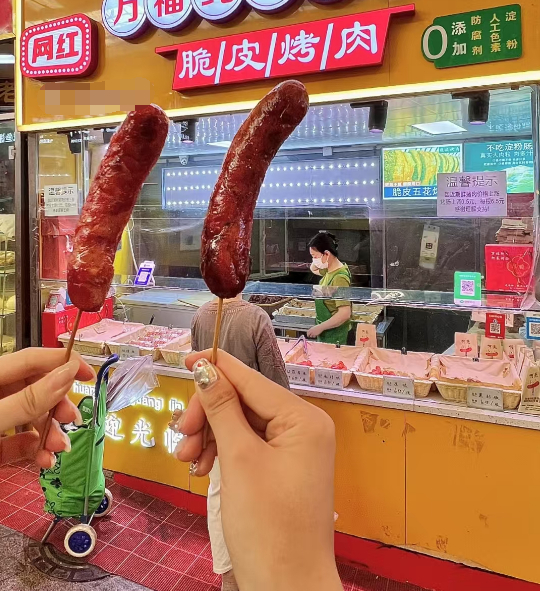 还有各种口味的脆皮烤肠,黑椒味的烤肠一口爆汁,微微咸,再配上黑胡椒的辛辣,大大减轻了油腻感。