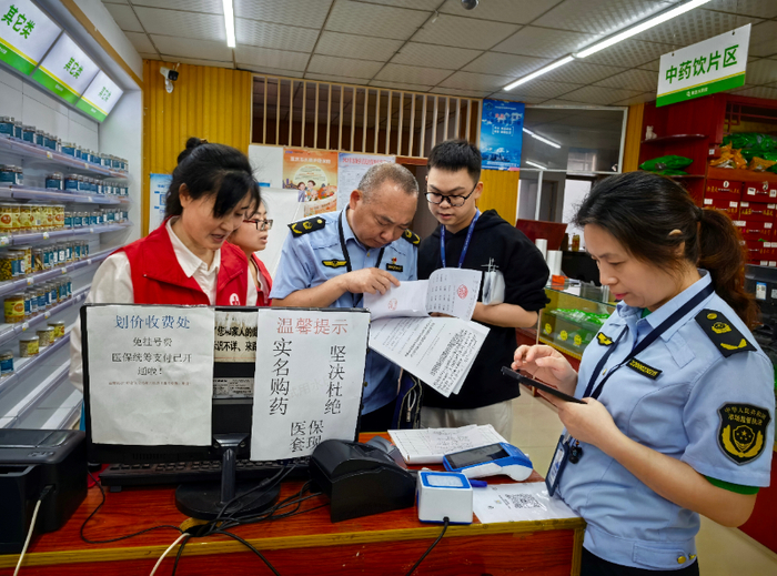 5月6日,敦仁街道市场监管所执法人员在一家药店通过智慧监管系统和查看进货发票等方式检查中药饮片的进货来源。
