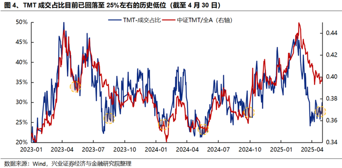 成交占比看,当前TMT成交占比目前已回落至25%左右的历史低位,与2023年和2024年历次科技风格调整到位时的水平相当。