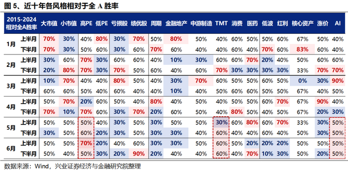 第一,业绩和关税两大前期压制科技板块的因素有望逐步缓解。随着4月底财报披露季结束,市场对科技板块的业绩担忧“靴子落地”。与此同时,关税扰动正在逐步过去,市场对于科技板块的定价有望逐步转向对于中长期产业趋势的关注。并且,从近十年风格表现的“日历效应”也能够观察到,财报披露季过后,进入5-6月,以高PE、TMT、AI为代表的高弹性科技风格的胜率将逐步提升。