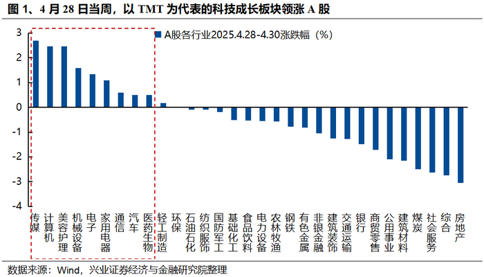 我们在4月27日报告《5月科技风格会回归吗?》中提示,随着内部财报陆续披露,以及外部关税扰动逐步过去,科技成长的布局时点已在逐步临近。而近期,我们已经看到TMT领涨A股,市场开始逐步演绎这一风格上的变化。