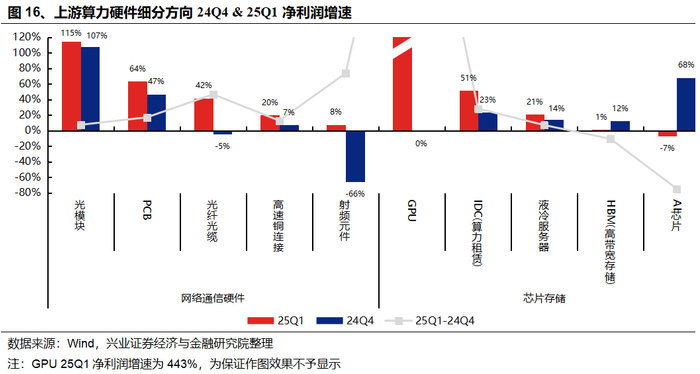 上游算力硬件产业链中,25Q1业绩增速较高且相对24Q4改善的方向包括:GPU、光模块、PCB、IDC(算力租赁)、光纤光缆等。