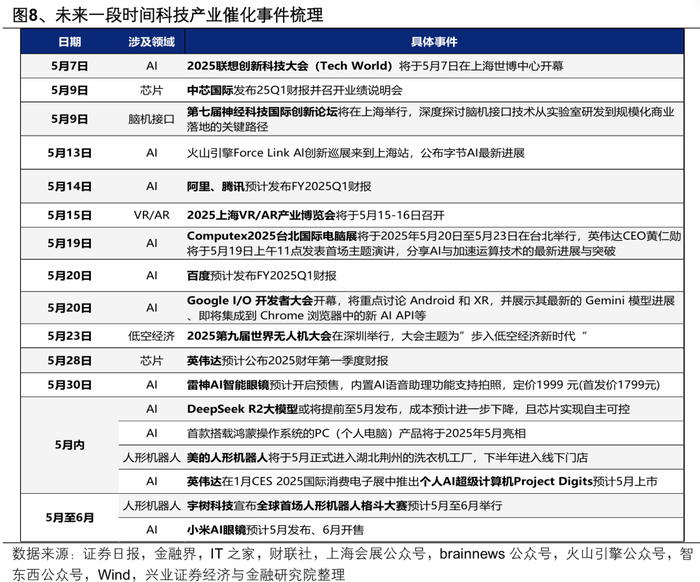 第三,新一轮科技行情离不开重要产业事件的催化,而5-6月本身也是科技重要产业会议密集催化的时间段。每年5-6月都是科技领域重要产业会议召开的时间点,典型如谷歌I/O开发者大会、台北国际电脑展、苹果全球开发者大会等。在这一时间段,国内科技板块受美股映射的效应更为明显。今年来看,除了常规的重磅会议催化外,随着国内科技领域迭代加速,AI、机器人、算力、低空经济等各类国内科技创新催化事件也层出不穷,都将成为新一轮科技行情的重要催化。