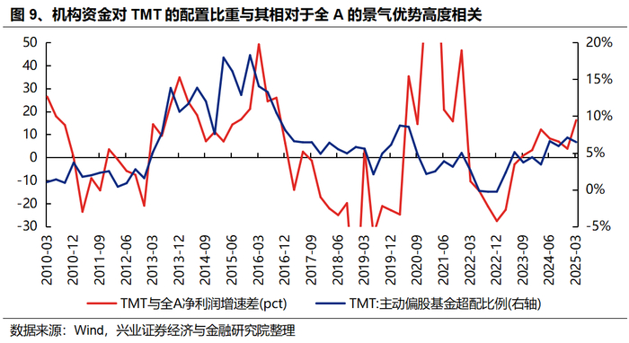 第四,随着TMT板块景气优势持续显现,机构资金仍有较大增配空间。2024年以来,TMT相对全A的净利润增速差持续下行,以计算机、传媒为代表的中下游是重要拖累。而2025年一季度,随着AI产业突破、内需复苏,中下游迎来困境反转,带动TMT相对全A的景气优势回归,两者净利润增速差由2024Q4的3.82pct大幅上行至2025Q1的16.19pct。然而,当前机构资金对计算机、传媒的配置比例均处于历史低位,且相较于市值占比仍然低配,有较大的增配空间,后续有望加速定价其景气的边际改善。